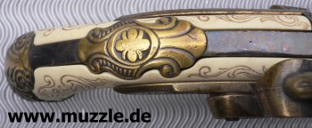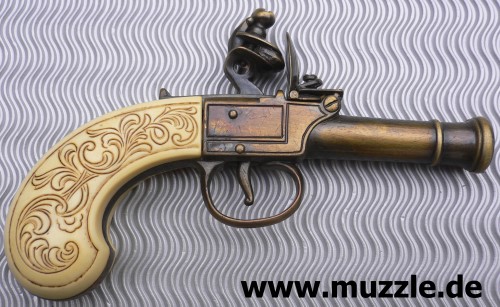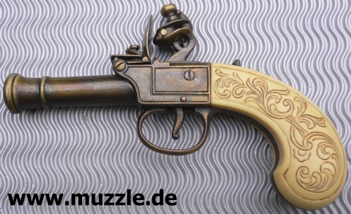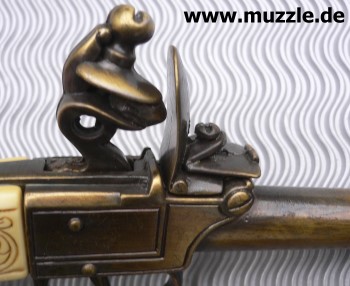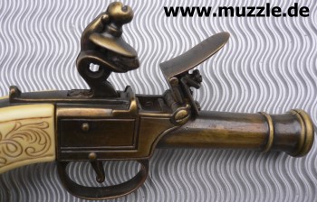 Steinschlosspistole Guss mit Plastikgriffschalen in Elfenbeinoptik, nicht schussfähig.