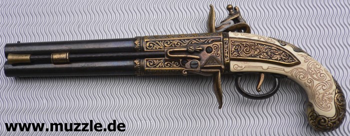 Doppelläufige Steinschlosspistole, nicht schussfähig.