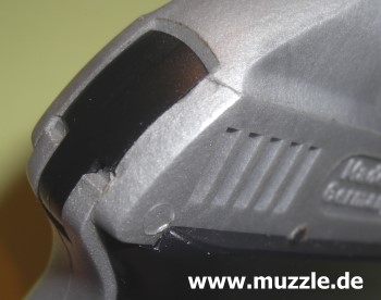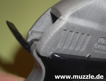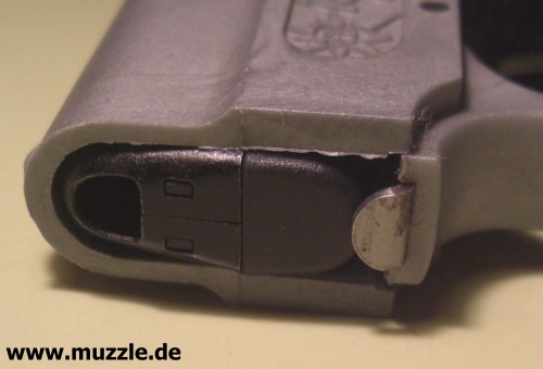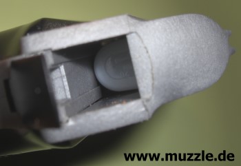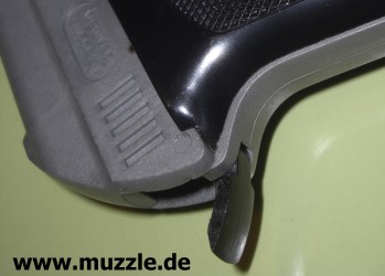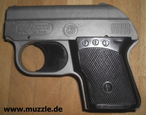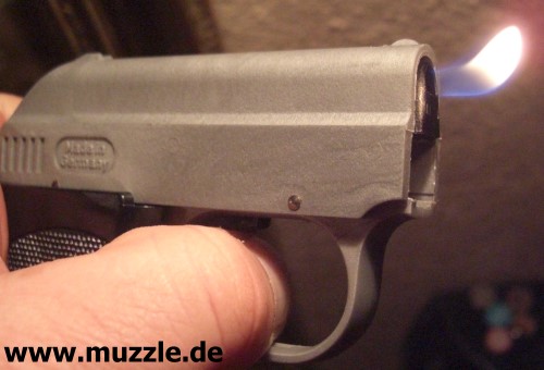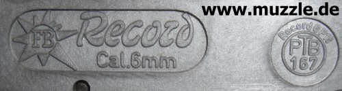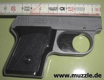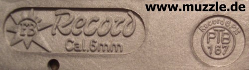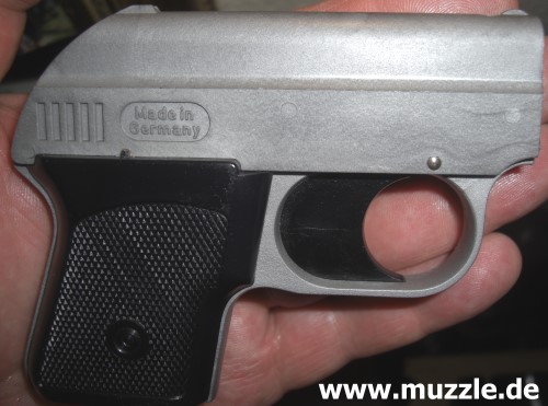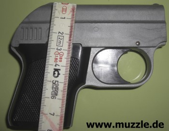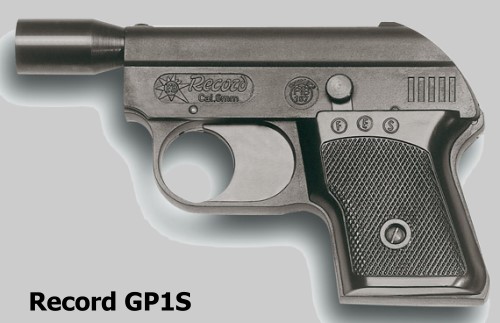 Foto unten zum Vergleich: Die Schreckschuswaffe (mit aufgeschraubtem Pyrobecher) “Record GP1S”, PTB 167: