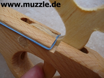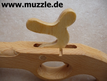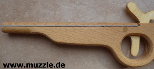 dem Abzug einlegen. Betätigt man den Abzug drückt der “Hahn” den Gummiring nach oben und schiebt ihn aus der Rastung. Auf 5 bis 7 m lassen sich anvisierte kleinere Ziele erstaunlich gut treffen. Ein Verletzungsrisiko