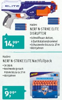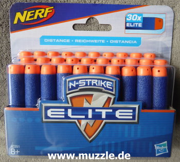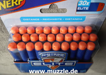 Trommelkapazität: 6 Geschosse (Darts) Antrieb: Federdruck mit Direkt-Kolben-System Feature: Schnellfeuerfunktion (Slam Fire) Reichweite: bis zu ca. 27 m max. (Herstellerangabe) Sinnvolle Reichweite: 1 - 6 m Visierung: Kimme und Korn nicht verstellbar Zielgruppe: Kinder 8+ Material: ToyGun aus Plastik (Polymer), Darts aus Schaumgummi mit Weichgummikappe Markierung: “CE”-Zeichen (Die Kennzeichnung muss nach §4 Geräte- und Produktsicherheitsgesetz (Richtlinie 88/378/EWG) auf dem Spielzeug oder seiner Verpackung / seinen Begleitunterlagen sichtbar und dauerhaft in mindestens 5 mm großen Buchstaben angebracht sein. (Geltung seit 1.1.1990). Hinweis: Die “N-Strike-Elite”-Serie ist die Weiterentwicklung der “N-Strike”-Reihe. Lieferumfang: Blaster mit 6 Darts, Beschreibung und Warnhinweis Warnhinweis: Nicht auf Augen oder Gesicht zielen. Nur Geschosse (Darts) verwenden, die für dieses Produkt entwickelt wurden. Geschosse und Blaster nicht verändern.