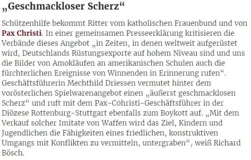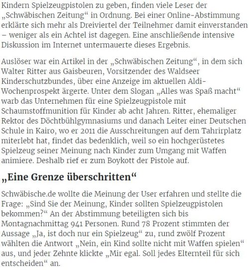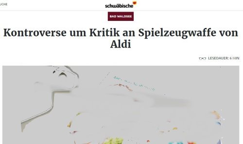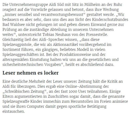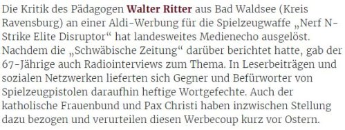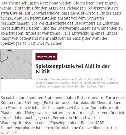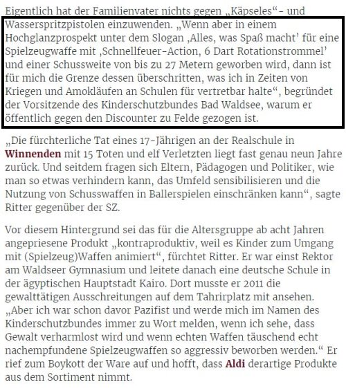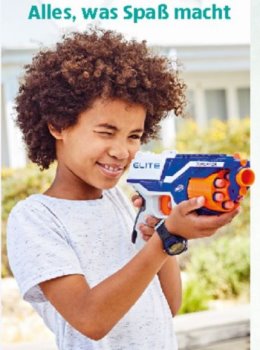Der Blaster wird über verschiedene Discounter, Spielzeuggeschäfte und im Versandhandel (z. B. “Amazon”) vermarktet. Werbung unten: “ALDI Süd” Fazit Beim “NERF Disruptor” von “Hasbro” handelt es sich um ein recht robustes Plastikspielzeug, welches Kindern ab 8 Jahren beim spielerischen Umgang mit einem harmlosen Schießgerät viel Spaß bereiten kann. Das Design ist Phantasiewaffen aus dem “Science-Fiction”-Genre nachemfunden und auffällig bunt gehalten, sodass es nicht mit einer realen, bzw. realistischen Schusswaffe verwechselt werden kann. Die verwendeten Geschosse sind sehr leicht und aus weichem, elastischem Material. Daher kann bei bestimmungsgemäßem Gebrauch eine Verletzungsgefahr im Grunde ausgeschlossen werden. Die Erziehungsberechtigten sollten den Kindern vor Gebrauch trotzdem die dem Blaster beiliegenden Warnhinweise vermitteln: Also nicht bewusst auf das Gesicht und die Augen zielen. Alles in allem birgt der Umgang mit den “NERF” ToyGuns nicht mehr Gefahren, wie sie auch von einer herkömmlichen, handelsüblichen Wasserpistole ausgehen. Reaktionen Wer nun aber glaubt, es gäbe nicht trotzdem noch ein paar hysterische Bedenkenträger die wegen dieser harmlosen ToyGuns den Untergang der Kulturen bzw. gleich den globalen Weltfrieden in Gefahr sehen, der hat sich getäuscht. Selbstgerechte, weltfremde Moralapostel die ihren ideologischen Weltrettungswahn gerne öffentlich breittreten, melden sich zu Wort und das sieht dann so aus, dass sie den Umgang mit Spielzeugwaffen allen ernstes unmittelbar mit Amokläufen und Kriegen in Verbindung bringen. Kein Scherz! Diese Schwachmaten meinen das ernst: