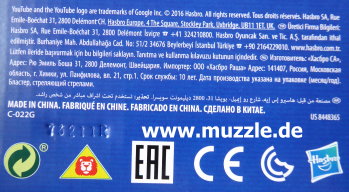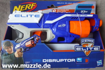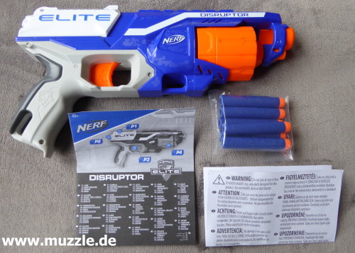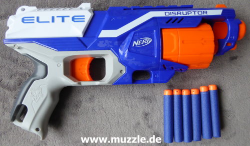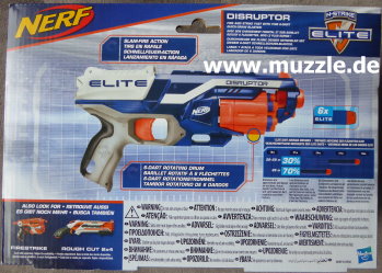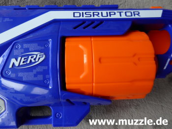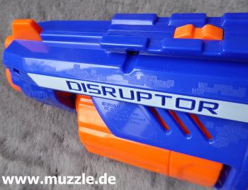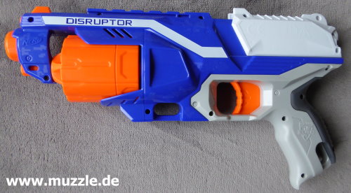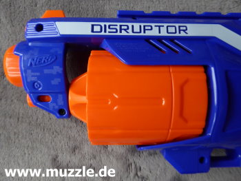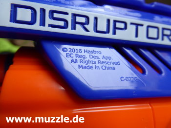 Hersteller: “Hasbro” (Hassenfeld Brothers), Pawtucket, Rhode Island, USA Marke: “NERF” (Made in China) Serie: “N-Strike Elite” Modell: “Disruptor” Seriennummer: 73211R Typ: Blaster (ToyGun Phantasiewaffe) Gattung: Revolver (Rotationsmagazin) Länge: 310 mm Höhe: 180 mm Breite: 62 mm Gewicht: 352 g (geladen)