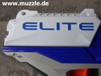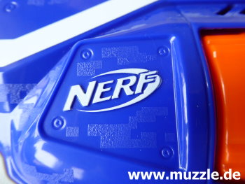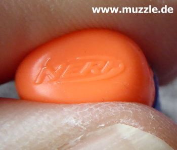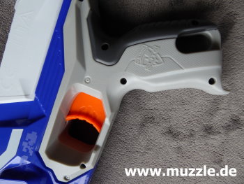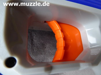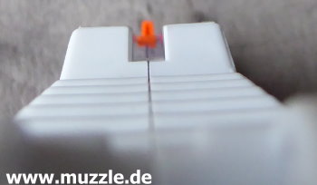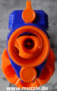 Visierung Die offene Visierung, bestehend aus Kimme und Korn, ist spielzeugüblich nicht verstellbar. Aber das leuchtend orangefarbene Korn ist gut erkennbar. Da der Blaster aber wenig präziese schießt, ist die Nutzung dieser Zieleinrichtung mehr oder weniger vernachlässigbar. Einfaches deuten in die gewünschte Schussrichtung ist da gemeinhin ausreichend.
