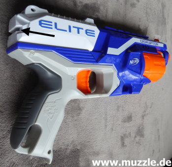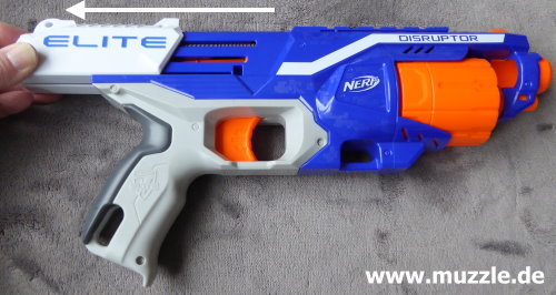 Der schwarze Pfeil im Bild unten links zeigt auf den Schlitz an der Rückseite des Blasters. Hier kann man erkennen, ob das Schlagstück schon gespannt ist. Sieht man im Inneren des Schachts das orangene Schlagstückbauteil, ist das ToyGun schussbereit.
