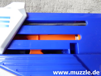 Schlitten, Trommel und Schussabgabe Die geladenen Geschosse werden per Federdruck aus der Trommel befördert. Dazu muss die innenliegende Spiralfeder vor jedem Schuss gespannt werden. Dies macht der Schütze, indem er den weißen Schlitten feste nach hinten zieht, bis das innere Schlagstück spür- und hörbar hinten einrastet (Foto unten).