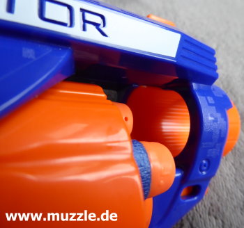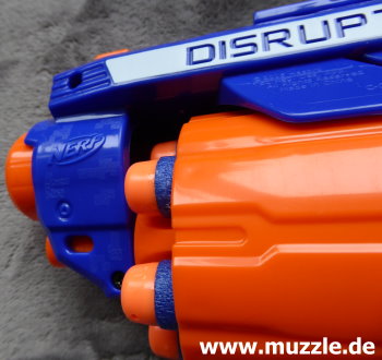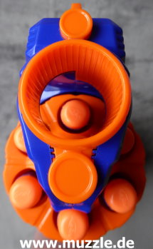 Gut gelöst: Da die Kammern der Trommeln Stifte enthalten, auf die die Hohlröhren der Darts aufgesteckt werden, können keine anderen Gegenstände, wie etwa Plastikkugeln oder andere harte Geschosse, geladen werden. Das dient der Sicherheit, da es zuverlässig vor unsachgemäßem Gebrauch schützt.