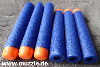Geschosse Die Geschosse, “Darts” genannt, haben eine Länge von 7,5 cm und einen Durchmesser von 1,2 cm. Sie bestehen aus weichem Schaumgummi, sind innen hohl und besitzen eine orangefarbene Kappe aus elastischem Weichgummi. Sie wiegen nur wenige Gramm und sind wegen der Kappe vorne schwerer als hinten. Da die Darts kein Leitwerk am Heck besitzen und federleicht sind, fliegen sie leider nicht sonderlich stabil, sondern geraten schnell ins Trudeln. Daher ist an ein wirklich präzieses Schießen nicht zu denken. Auch die angegebene maximale Reichweite von 27 m ist eher als Werbegag anzusehen und vielleicht dann erreichbar, wenn man ein Geschoss bei kräftigem Rückenwind schräg nach oben in eine Parabelflugbahn versetzt. Realistisch betrachtet, ist lediglich bei einer Schussdistanz von 1 - 6 Metern ein halbwegs gezielter Schuss möglich, bei dem aber auch nur eine relativ geringe Energie am Ziel ankommt. Die berühmten Knallkorken-, Erbsen- oder Gummizugpistolen früher Kindergenerationen waren dagegen deutlich “gefährlicher”, wenn man dieses übertriebene Wort hier überhaupt ins Feld führen möchte. Wer hat denn im Kindesalter nicht an “Cowboy-und-Indianer-”, bzw. “Räuber-und-Gendarm”-Spielen teilgenommen und dabei fleißig mit Spielzeugwaffen hantiert.