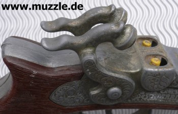 Doppelläufiger Perkussions-Derringer für Knallhütchen. Guss mit Plastikgriffstück in Holzoptik. Hähne können einzeln gespannt werden und lösen einzeln nacheinander aus. Single Action only. Länge 220 mm.