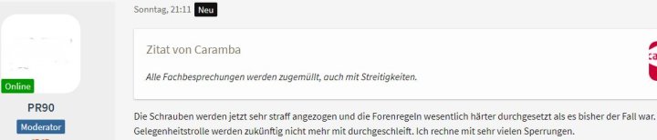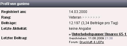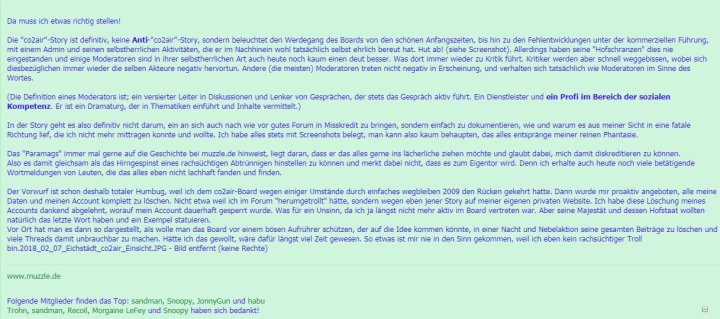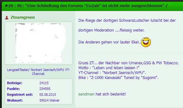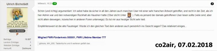 Aber nach diesem kurzen Abschweifen zurück zum eigentlichen Thema: - Längst schon hatte die clevere und umtriebige Marketingabteilung der Waffensparte des „UMAREX“-Konsortiums durch aufmerksames Mitlesen und u. U. auch dezentes Mitposten den ungeheuren Marktwert von „CO2air.de“ erkannt und über die Bannerwerbung hinaus sukzessive für sich erschlossen. Besonders im Segment Schreckschusswaffen gab es auch mal Aktivitäten wie Waffenbelastungstests unter Mitwirkung bzw. im Austausch mit versierten Anwendern. Immerhin war der leitende Admin bei „Co2air.de“ ja auch Chefredakteur und Fachjournalist der Waffenfachzeitschrift VISIER. Es wäre dumm und ungeschickt, solche langjährig bestehenden Verbindungen ungenutzt brachliegen zu lassen. Nachdem sich - wie bereits erwähnt - das eigene Diskussionsforum auf der „UMAREX“-Homepage als ziemlicher Flop herausgestellt hatte, erwuchs wohl irgendwann der Plan, dass bekannte und gut frequentierte „Co2air“-Forum mittelfristig zu einer Art inoffiziellem „UMAREX“-Hausforum zu erkoren. Es wäre ja in der Tat beinahe schon fahrlässig, solche Chancen brachliegen zu lassen. Bei „UMAREX“ hat man die Zeichen der Zeit gut erkannt und eine perfekte Möglichkeit erschlossen, direkt und ggf. auch mal indirekt mit den Anwendern der eigenen Produkte kommunizieren zu können. Entwicklungen, wie gemalt: Der ehemalige „VISIER“-Chefredakteur und „Co2air“-Forenleiter, Ulrich Eichstädt, ist vor kurzer Zeit zum Pressesprecher-Darsteller bei „UMAREX“ / „Walther“ ernannt worden. - „muzzle.de“ berichtete: http://www.muzzle.de/Allgemeines/Eilmeldung/eilmeldung.html Die freigewordene „Stelle“, Forenleitung bei „Co2air.de“, füllt nun - gefühlt wohl eher pro forma - , also als eine Art „Frühstücksdirektor“ oder „Grüßonkel“, der „VISIER“-Mitarbeiter Andreas Wilhelmus aus. Realistisch betrachtet, ist aber die aktive Admin- und Mod-Crew quasi führungslos sich selbst überlassen. Das wiederum hat zur Folge, dass die Selbstherrlichkeit und Arroganz einiger Admins-/Mods einen schier unerträglichen Status angenommen hat, der sich in erweiterter Kritikunfähigkeit und unsäglichen, vorpubertären Aussagen, wie z. B.: "Unsere Straße, unsere Regeln!" (Übersetzt: „Friss oder stirb“, bzw. „halt Dein Maul“), manifestieren. Offenbar fehlt dem einen oder anderen eine regelnd eingreifende Hand „von oben“, weil er sich selber nicht ausreichend im Griff hat. Moderieren im Wortsinn ist das jedenfalls nicht. Gefördert und befeuert wird das ganze Wichtiggetue noch dadurch, dass spezielle „Co2air“-Leutchen vom neuen UMAREX-Pressesprecher-Darsteller Einladungen zu „seit Jahren geplanten Besuchen“ und zu „internen Gesprächen“ und Werkbesichtigungen erhalten. Man inszeniert hier perfekt den Eindruck, die Männeken gehören sozusagen zum erweiterten Insiderkreis von UMAREX. Naja, wo nun schon mal „zufällig“ gerade ein geeigneter Schulungsraum in Arnsberg frei war, kann man den auch mal anbieten und von der anderen Seite mit reinrutschen... ;-)) ...und wenn man schon mal „zufällig“ hier ist, dann gibt’s auch gleich ein interessantes VISIER/UMAREX-Rahmenprogramm, dass nicht wirklich „ungelegen“ kam. Nachtigall, ick hör dir trapsen. Freundschaftsdienste und Brosamen für gewisse Seilschaften und Büttel? M. E. steht nun zu befürchten, dass das Ego jener „elitären“ Sitzungs- und Rahmenprogrammteilnehmer bis zum Platzen aufgeladen wurde. Wie sich das als Rückkopplung wohl auf den zukünftigen Diskussions- und Moderierstil einiger dieser VUPs... äääh.... „VIPs“ auswirken wird? Ein lesenswerter Thread, vom Anfang bis zum Ende, also seiner unrühmlichen Schließung: http://www.co2air.de/wbb3/index.php?page=Thread&threadID=88290 (Zitat Ulrich Eichstädt, Pressesprecher „UMAREX“) Also verfügen nun einige über Kenntnisse aus erster Hand, andere nicht. So ist das Leben.(...) Der Besuch war seit Jahren geplant, schon noch mit Old Surehand und mir als Admins. Terminlich hat es aber
