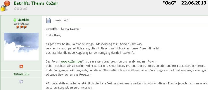 8.MAi 2022 Nach fast drei Jahren, aus gegebenem Anlass, werfe ich noch mal einen Blick auf das “co2air”-Forum. Grund ist die unten gezeigte Verlautbarung vom 1. Mai 2022: