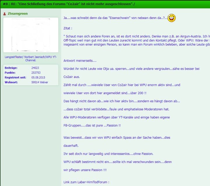 Der „www“-Weltraum, unendliche Weiten. Wir schreiben das Jahr 2013. Dies sind die Abenteuer des “Raumschiffs” Co2air.de, das mit seiner 43.240 Mann starken Besatzung viele Jahre unterwegs ist und dabei in Regionen vordrang, die noch nie zuvor ein Waffenforum erreichte... ;-) ...zumindest, wenn man das im Selbstverständnis des Eigentümers und seiner willfährigen Mitläufer und Wasserträger betrachten möchte, die es gerne vermeiden über den berühmten Tellerrand hinaus zu schauen. Betrachtet man es jedoch realistisch, findet man heuer ein Forum vor, das zwar gerne mit Masse wuchert, aber qualitativ leider erheblich in der Senke steckt. Was ist zwischenzeitlich geschehen? Viel! Sehr viel sogar! Wer die teils recht unappetitlichen Details lesen möchte, der sei an dieser Stelle auf die „co2air-Story“ verwiesen, deren Fortsetzung in Teil 8 (aus Zeitmangel) derzeit noch in Arbeit ist. Fassen wir hier mal nur grundlegendes zusammen: Aussagekräftige Reviews und Erfahrungsberichte zu Neuerscheinungen im Bereich CO2- und Druckluftwaffen werden zur absoluten Mangelware. Frage nicht, was das Forum für Dich tun kann, tue etwas für das Forum. Dieses Denken ist wohl erloschen, es wird vorrangig nur mehr konsumiert. „Co2air.de“ laufen langjährige Stammuser und „Member“ mit Expertenstatus in Scharen davon. Viele fachlich versierte User und Teammitglieder mit ausgleichendem Diskussions- und Moderierstil geben ihr Engagement entnervt auf oder ziehen sich zumindest weitestgehend zurück. Der Umgangston seitens einiger Mitglieder des Moderatoren-Teams erreicht ein sehr niedriges bis unappetitliches Niveau. Auch vor öffentlichen Beleidigungen und „an den Pranger stellen“ wird nicht mehr zurückgeschreckt. Interessanterweise verbreitet sich der Sittenverfall insbesondere bei jenen Vertretern, die weniger durch Fachkompetenz als vielmehr durch Wichtigtuerei, Blockwartmentalität und Chefgehabe bestechen. Offenbar ist einigen die Herrschaft über die „Knöpfe“ in der Admin- / Moderatorenkonsole zu Kopfe gestiegen. Man geriert sich dann gerne als unfehlbarer, gottgleicher Herr über die schnöden Untertanen, also jene User, denen die Ehre und Gnade zuteil wird, das kostenlose und dabei natürlich konkurrenzlos tolle Angebot von VISIER/„co2air.de“ gnädigst nutzen zu dürfen. Von wegen konkurrenzlos! Im Jahr 2012 entstand mit „Outdoorandguns.de“ (OaG) ein neues Angebot: Ein Diskussionsforum mit ähnlichem Bezug wie „Co2air.de“. Und so kam was kommen musste: Viele ehemalige User des „Co2air.de“-Forums registrierten sich dort und man fand lange vermisste Experten und liebgewonnen Gesprächs- und Diskussionsteilnehmer wieder, die dem patzigen, selbstherrlichen und restriktiven Führungsstil mit Kindergartencharakter im „Co2air“-Forum entnervt und enttäuscht den Rücken gekehrt hatten. Bei „Co2air.de“, dem selbstempfundenen Mittelpunkt im www-Waffenkosmos, betrachtete man diese Entwicklung zunächst mit selbstherrlich zur Schau gestellter Gelassenheit, glaubte aber da wohl noch an eine Totgeburt. Mit der Zeit sah man aber argwöhnisch „nebenan“ doch ein ernstzunehmendes Konkurrenz-Board erwachsen. Was liegt da also näher, als diese Plattform verächtlich zu machen und als „Sammelplatz der Co2air.de-Verstoßenen“ zu erklären. Dabei ignoriert man natürlich geflissentlich die unangenehmen Tatsachen, dass sich die weitaus meisten, vorher eigenmotiviert - weil angewidert - aus dem „Co2air“-Board verabschiedet hatten. Außerdem gibt es viele, die nun beide Plattformen nutzen und es tauchen längst auch Neuzugänge bei „OaG“ auf, die zu „Co2air.de“ überhaupt keinen Bezug hatten und haben. Tja, aber das will man sich natürlich nicht eingestehen im Reich der Selbstherrlichkeit. Also bleibt man stur bei der falschen Behauptung, die auch durch das dauernde Wiederholen nicht wahrer wird. Offenbar sitzt der Stachel des gelungen Aufbaus der Konkurrenzplattform „OaG“ doch recht tief. Vor allem, da man dort zwar permanent und interessiert Mitliest, aber auf unliebsame Aussagen keinen direkten Einfluss nehmen kann, wie man es im eigenen Verfügungsfeld durch Thread-Schließungen, Posting-Löschungen und User-Bannungen so gerne und häufig praktiziert. Leider macht man bei „OaG“ aktuell im Gegenzug den Fehler und schenkt dem Geschehen auf „Co2air.de“ zuviel Beachtung. Auch hier wird permanent das Gegenüber beobachtet und immer wieder gelästert und gestänkert, anstatt sich auf den eigenen Weg und Sachthemen zu fokussieren. Das führt nicht nur zu Querelen der beiden Foren untereinander, sondern auch im internen Miteinander bei „OaG“ zu erheblichen Missstimmungen mit kindischem Gezänk, wo dann ein böses Wort das andere ergibt. Thread-Schließungen und Account-Löschungen inklusive. So gesehen begibt sich „OaG“ in diesem Punkt leider in die gleiche Richtung wie „Co2air“ und wird nach meinem Empfinden auch diesbezüglich langsam aber sicher zu einer Konkurrenz im negativen Sinne. Schade, denn hier wird m. E. eine gute Chance vertan, einiges besser zu machen. Statt dessen macht man sich selbst zum Gespött und verspielt mit kindischem Verhalten jegliche Seriosität. Leider keine gute Entwicklung die sich zuletzt dort etabliert hat. Missgunst, Neid, Vorwürfe, gekränkter Stolz und Eifersüchteleien. Off-Topic-Themen schießen wild ins Kraut. Kein Wunder, dass das bei so manchem letztlich zu einer totalen „Forenmüdigkeit“ führt. Immerhin versucht der Forenbetreiber mit entsprechenden Regelungen gegenzusteuern. Hoffentlich greift das: