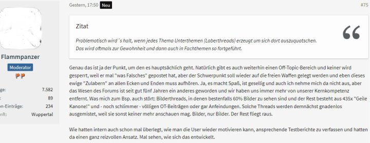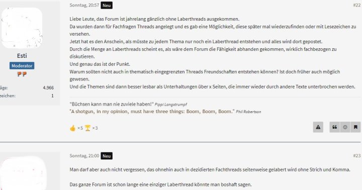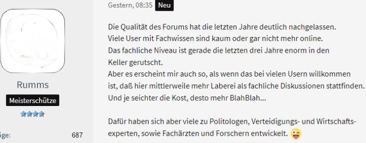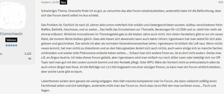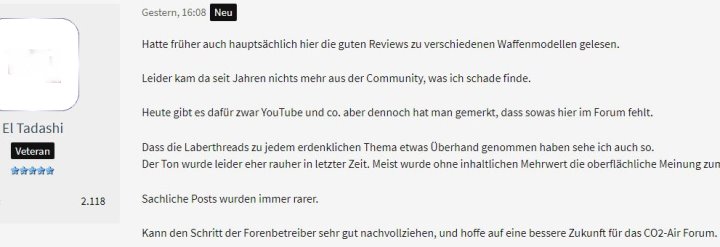 Der Groschen ist gefallen Spät, sehr spät,… fast zu spät, ist der sprichwörtliche Groschen wohl endlich gefallen. Die „co2air.de“-verantwortlichen Hobby-Moderatoren des kommerziellen Boards („VS Medien GmbH“) verkündeten jüngst „Änderungen im Forum“. Es ist etwas, das leicht pathetisch als „Der neue Weg“ beschrieben wird. – Echt jetzt? Worum geht’s denn? – Es wird endlich (hoffentlich) das umgesetzt, was langjährige Diskussionsteilnehmer, Beobachter und Warner schon seit vielen Jahren fordern: Das Gegensteuern gegen erhebliche Fehlentwicklungen in der Nettiquette, der Stagnation im Allgemeinen und der signifikanten Mangelerscheinungen im Bereich des Substanziellen. Brauchbare Waffentests oder wenigstens mal ausführliche Erfahrungsberichte von Usern über Waffen- und Zubehör-Neuerscheinungen, Alltagswaffen oder historische Raritäten… alles so selten wie die „Blaue Mauritius“ oder die „British Guiana“ in der Numismatikszene. Und wo sind in dieser Beziehung die Beiträge von Mods und Angehörigen der bräsig gewordenen „Member“-Gruppe, wo sind jene, die mit gutem Beispiel vorangehen? Fehlanzeige! Das Forum quillt stattdessen über von Off-Topic- und Laber-Themen, ist vollgemüllt mit epischem Schmonz und massenhaft frühpubertären Streitereien bis hin zu handfesten, justiziablen Beleidigungen. Das hat über Jahre dazu geführt, dass sich viele User mit fundiertem Fachwissen und echte Experten auf so manchem Spezialgebiet aus dem Forum gelangweilt, entnervt oder verprellt zurückgezogen haben, was einen erheblichen Qualitätsverlust zur Folge hatte. Masse statt Klasse wurde zum „Markenzeichen“. Dazu zwar stets bemühte, aber nicht selten überforderte Moderatoren. Und leider auch solche, die gerne mal provokativ und mit selbstherrlicher Attitüde auch noch Öl ins Eskalationsfeuer gießen. Warner, mich eingeschlossen, gab es zur Genüge. Wegweiser gab es mehr als genug. Aber die wurden dann gerne als „Meckerköppe“, „Abtrünnige“, „Missgünstlinge“ und „Neider“ abqualifiziert. Alle Hinweise prallten auf taube Ohren an selbstgefälligen Köpfen. In meiner „co2air“-Story ist nachlesbar, dass ich als quasi Gründungsmitglied des „co2air“-Forums, meine Wahrnehmung der deutlich negativen Entwicklung und deren daraus resultierenden Folgen schon vor über 10 Jahren (!) prognostiziert hatte. Jetzt wurde wegen des Leidensdrucks die Reißleine gezogen, eine Abwägung zwischen hartem Kurswechsel oder gar Aufgeben. Traurig, dass es soweit kommen musste. Wer den Schaden hat, braucht natürlich für Häme und Spott nicht selbst zu sorgen. Das bekommt man gratis aus einem kleinen grünen Schatten-Forum dazu. Dort zerreißt man sich über das an der Stelle gerne despektierlich als „Hirntod-Forum“ bezeichnete „co2air“-Board ständig das Maul. Was Wunder? In dem man andere erniedrigt, kann man sich selbst künstlich erhöhen. Eigenlob stinkt gewaltig. Auch ein Konzept… von wegen „united“. Dieses forenübergreifende Gezänk und missgünstige Belauern und Bashen dient auch nicht gerade dazu, dass sich seriöse und fachorientierte Nutzer in diesem Medium wohlfühlen und fest einrichten. Sargnägel gibt es viele. GUNIMO