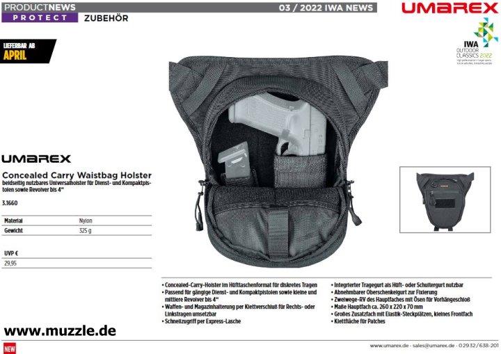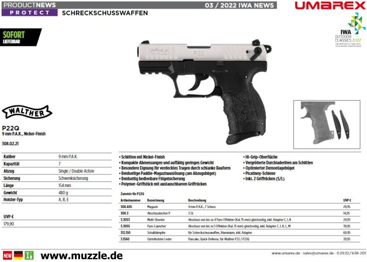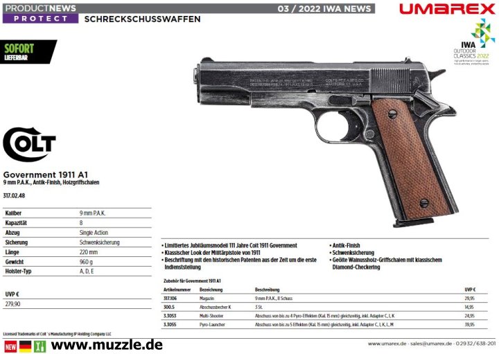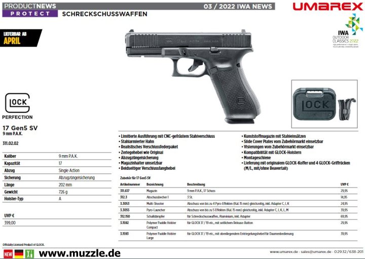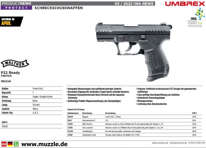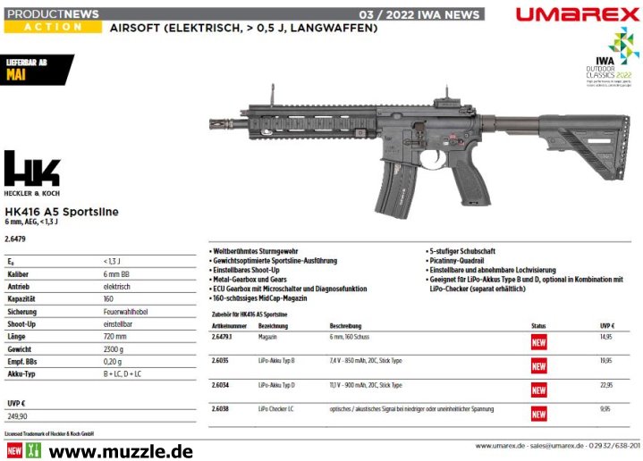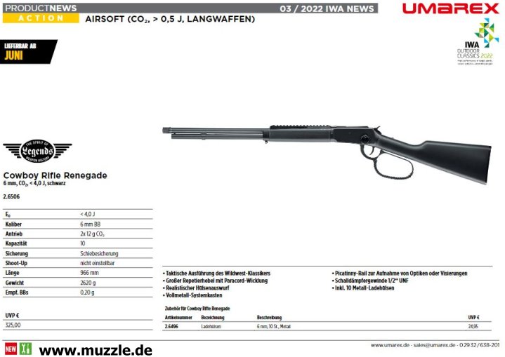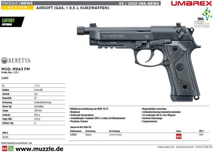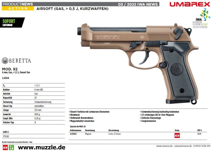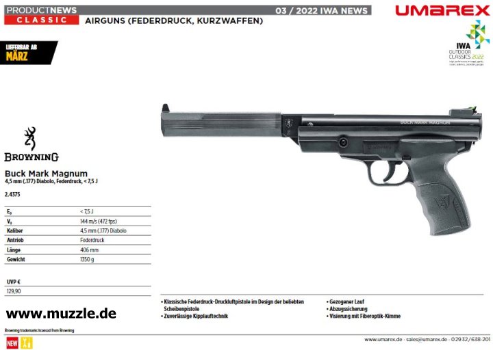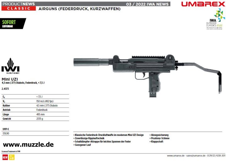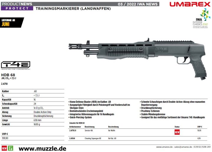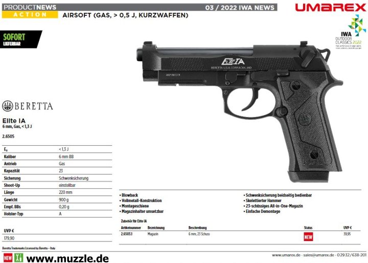 Schuss, Energie < 3 Joule, Länge 215 mm, Gewicht 810 g.