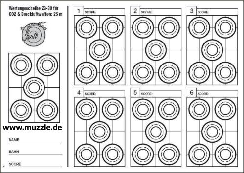 Insgesamt bergen populäre Aktivitäten und Maßnahmen dieser Art nicht zuletzt auch einen positiven Effekt auf den gesamten legalen Waffenbesitz, und führen letztlich zu einer realistischeren Beurteilung des Schießsports und seiner Aktivisten in der öffentlichen Wahrnehmung und Meinungsbildung. Bedingt durch bloße Unkenntnis, rational nicht erklärbarer Abneigung gegen Schusswaffen und allgemeiner Vorurteile - geschürt durch unseriöse Berichterstattung in den Medien - gelten auch die zuverlässigsten Waffenbesitzer vielen als unberechenbare Rambos und potentielle Amokläufer. Je mehr Menschen an den Schießsport herangeführt werden, desto offener und vor allem realistischer wird die kollektive Sichtweise auf diesen Breitensport ausfallen. Und im Angesicht einiger Millionen deutscher Schützen kann man mit Fug und Recht von Breitensport sprechen. Die schönen und vielschichtigen Facetten dieses Sports muss man seinen Betreibern ja nun nicht mehr nahe bringen, sondern viel mehr interessierten Laien und den Kritikern. Ich denke, dazu werden die getroffenen Maßnahmen im Rahmen der begrüßenswerten Kooperative zwischen BDMP und UMAREX ein Stück weit beitragen und hoffentlich weitere Partner und Nachahmer auf den Plan rufen. In diesem Sinne herzlichen Glückwunsch und vielen Dank an die Verantwortlichen dieser Initiative. Mein besonderer Dank gilt Uwe Möller (BDMP Referent Jugendsport), für die freundliche, umfassende und zeitnahe Versorgung mit Informationen für diesen Bericht! - Nachtrag Mai 2007: Neue Scheibe “ZG30 - 25 m” eingeführt. Format DIN A4 quer: