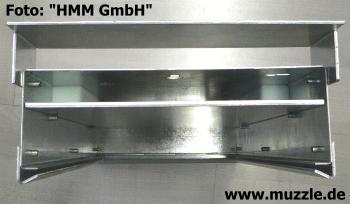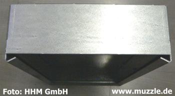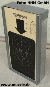 Ein passender Kugelfang für das neue Scheibenformat wurde natürlich auch aufgelegt und ist bereits von einem unabhängigen Schießstandsachverständigen erfolgreich abgenommen. Hier hat die Firma “HHM GmbH” die Entwicklung und Fertigung übernommen. www.stahlziele.de Der Geschossfang im Format 170 x 315 mm, 2 mm Materialstärke und angewinkelten Frontkanten wird exklusiv für die Firma UMAREX gefertigt und von dieser vermarktet. Der Kasten ist multifunktional nutztbar, denn er kann, quer aufgehangen, mittels Adapter mit kleinen Fallplatten und Pendelzielen ausgerüstet werden. Modifiziert mit einer etwas dickeren Prallplatte und anderen Schaumstoffeinlagen kann er ggf. sogar für KK zugelassen werden und ist auch für die 16 Joule ("Europanorm") Druckluft & CO² Waffen ausreichend widerstandsfähig. Die Fotos unten stammen von “HHM GmbH” Inhaber Herrn Volker Hack. Vielen Dank.