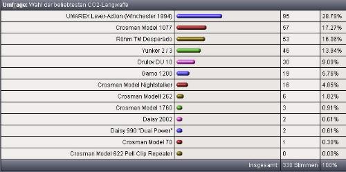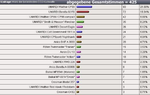 Am Ende des hoch interessanten Rundgangs, bei dem ich viele aufschlussreiche Einblicke bekam und schöne Eindrücke gewinnen konnte, war mir dann die Möglichkeit gegeben, mit den Herren Fischer und Beisheim noch etliches zu erörtern, weitere Fragen zu stellen, und in den Meinungsaustausch zu treten, währenddessen für das leibliche Wohl gesorgt war. Ein interessantes Gesprächsthema war u. a. die jüngste Umfrage, die ich im größten deutschen Waffenboard (>9.500 registrierte User) www.co2air.de Anfang Januar 2006 gestartet hatte, und die just am Tage meines Besuches zu Ende ging. Gefragt wurde nach den beliebtesten CO2-Kurz- und -Langwaffen (Plinkingwaffen), wobei jeder Teilnehmer nur jeweils eine Stimme abgeben konnte. Die beiden nachfolgenden Screenshots zeigen die Resultate. (Weitere Details zu den Umfragen bitte im “co2air.de”-Forum nachlesen.)