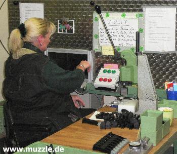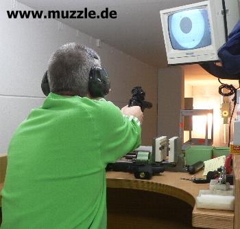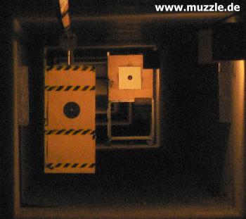 Das Ein- und Auslagern der Güter erfolgt mittels EDV-gesteuerter elektronischer Erfassung des Lagerplatzes nach dem Chaosprinzip. Das heißt, der Computer weist der Ware immer den gerade freien Lagerplatz zu, ohne Rücksicht auf irgendwelche Ordnungskriterien nach Warenart. Herr Beisheim machte mich explizit auf die Heizungsanlage des Lagers aufmerksam (Bild oben links). Die Besonderheit: Die Heizelemente hängen unter dem Dach der hohen Halle, strahlen die Wärme nach unten ab und sind nach oben hin isoliert. Die Wärmeschichten bauen sich abwärtsgerichtet auf, was nur in Räumen funktioniert, die wenig Luftzirkulation ausgesetzt sind. Ständig offene Türen oder gar ein Gebläse würden den Heizeffekt stören. Diese Technik wurde in einem Unternehmen aus dem UMAREX-Konsortium entwickelt und gilt als umweltschonend, da wenig Wärmeenergie ungenutzt abgeleitet wird. Bemerkenswert: Wo man auch hin kam, überall in den Werkhallen wirkte es sauber und geordnet, auch dort wo geschäftiges Treiben herrscht, und, wie z. B. im Galvanik-Bereich, gar mit Chemikalien gearbeitet wird. Von “Giftküche” also keine Spur, und selbst im Lager, das nach der sogenannten “Chaosmethode” arbeitet, kein Anzeichen eines eben solchen. ;-) Station 14: Schießstand Luftdruck-/CO2-Waffen Am gut ausgerüsteten Schießstand lagen die CO2-Kurzwaffen “Desert Eagle” und “Beretta XX-treme” aus, mit denen ich einige Durchgänge absolvieren durfte. (Bild unten links)