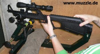 Der UMAREX Softair-Experte Armin Fuhr gab mir nach einer kurzen Einweisung die Gelegenheit, eine Softairwaffe der Premiumklasse zu testen. Dabei handelte es sich um ein Federdruckgewehr des Herstellers “Maruzen” Modell “APS96” (Bild oben rechts). Neben der guten Verarbeitungsqualität sowie Funktions- und Detailgenauigkeit, fiel die hohe Präzision dieses 30-Schuss-Repetierers positiv auf. Herr Fuhr lobte die Waffe als so treffgenau, dass sie bei abgeschaltetem “HopUp” als Testgerät für neue Munitionssorten im Kaliber 6 mm herhalten darf. Bei einer Länge von 1.150 mm und einem Gewicht von 3.350 g hält man mit der “APS96” eine sehr realitätsnahe Softairwaffe im Anschlag, die begeistern kann. Herr Eyck Pflaumer, einer der Juniorchefs des Unternehmens, nahm sich ebenfalls Zeit zur Kontaktaufnahme, und ließ es sich nicht nehmen, uns auf den neuen 100-m-Großkaliber-Schießstand zu begleiten, ebenso wie Herr T. Fischer, der nun auch wieder dazustieß und ebenfalls für Erläuterungen zur Verfügung stand. Immerhin ging es nun ja u. a. auch um die Vorstellung einer innovativen UMAREX-Waffenneuerscheinung, die bis dato ein sehr gut gehütetes Geheimnis darstellt... was zunächst auch noch so bleiben wird! :-) Station 15: 100-m-Großkaliber Kellerschießstand Hier traf unsere Gruppe auf Herrn H. Kurth, der bei UMAREX für die Schießtests zuständig ist. Bei der Vorstellung wurde klar, welche Fähigkeiten ihn zu dieser Aufgabe prädestinieren, denn Hubertus Kurth war u. a. “Deutscher Meister 100 Meter KK” im Jahr 2002, Gewinner “Grosser Preis 2000 Luftgewehr” und erzielte viele weitere Erfolge in früheren Jahren.