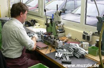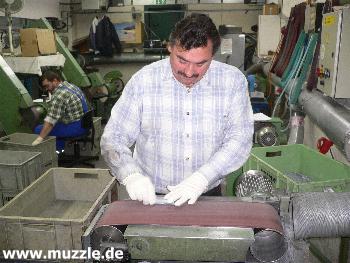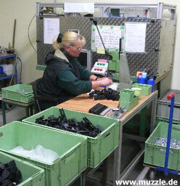 Nach der Besprechung des geplanten Tagesablaufs begann die systematische Führung durch den Betrieb, in dem sich seit meinem letzten Besuch doch das Eine oder Andere verändert hatte. Auch wurden im Rahmen der Führung Bereiche gestreift, die für mich Neuland waren. Kompetent und detailreich erfolgte die Führung durch den technischen Leiter des Waffensektors, Herrn Olaf Beisheim, der sich viel Zeit nahm, um alle Fragen geduldig zu beantworten. Station 1: Entgraten angelieferter Zinkspritzgussteile in Handarbeit