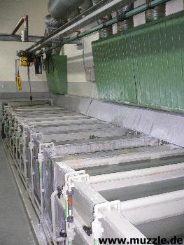 Die Oberflächenbearbeitung mittels Sandstrahlgebläse ergibt eine sehr raue, matte und fettfreie Oberfläche, die beinahe aussieht wie geeist. Hier werden Zinkkompensatoren dieser Prozedur unterzogen. Foto oben: Hinten im Bild ein fertig gestrahltes Werkstück, vorne ein noch unbehandeltes Exemplar. Olaf Beisheim führte dazu aus, dass, je nach Behandlung der Metalloberfläche, das Finish der später fertigen Waffe einen ganz eigenen Schimmer aufweist. Dies gilt auch und besonders, wenn die Waffe fertig brüniert, oder vernickelt ist. Der jeweilige Effekt, so Beisheim weiter, wird durch die unterschiedliche Lichtbrechung auf der Metalloberfläche erzeugt. Die Nickelschicht oder Brünierung lässt diesen Effekt zu, da sie sehr dünn aufgebracht wird. Station 8: Galvanisierung und Brünierung in Tauchbädern Unter Galvanik versteht man das elektrolytische Überziehen von Metalloberflächen mit anderen metallischen Schichten: Vernickelung, Verkupferung, Verchromung. Es dient der Veredelung der Oberflächen und dem Schutz vor Korrosion. Die Brünierung findet in ein- oder mehrstufigen Prozessen (Tauchvorgängen) statt. Die Werkstücke werden nach dem gründlichen entfetten in siedender alkalisch oxydierender Lösung bei Temperaturen um 140 °C behandelt. Anschließend muss die Brünierlösung abgespült werden, um ein „Ausblühen“ (auskristallisieren des Brüniersalzes) an der Werkstückoberfläche zu verhindern. Danach werden die Teile beölt um einen Korrosionsschutz zu bewirken.