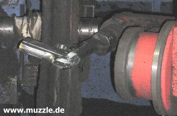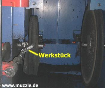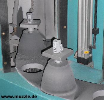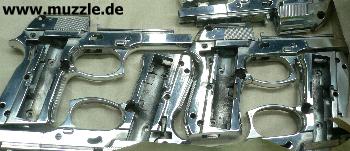 Neben vielen Sicherheitsauflagen ist eine der markantesten sicherlich die sogenannte Laufsperre. Dabei handelt es sich um meist mehrteilige Verbauungen des Innenlaufs, bestehend aus einer sehr harten Stahlsorte. Was zum Einen die unseligen „Bastler“ von ihrem illegalen Tun abhalten soll, dient zum Anderen auch der Funktion der Waffe. Ohne den durch die Laufverbauung erhöhten Staudruck, würde das Repetieren des Schlittens wohl nicht einwandfrei funktionieren, da aus den Platz-/Gaspatronen kein Projektil verschossen wird. Die Bilder zeigen den Arbeitsschritt, bei dem die Laufsperren unter großer Hitzeeinwirkung mit dem Lauf verlötet werden. Die recht eindrucksvollen Bilder mit Blick in das Innere des Lötofens, den die Läufe auf einem Transportband durchqueren, verdanke ich dem freundlichen Tipp eines UMAREX-Mitarbeiters, der mich auf diese günstige Perspektive hinwies. :-) Station 5: Poliermaschine Zinkspritzguss glänzend! Hier Griffstücke der Beretta FS 92 (CO2). Und nein, diese sind keineswegs verchromt, sondern „nur“ poliert.