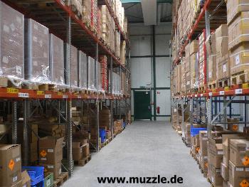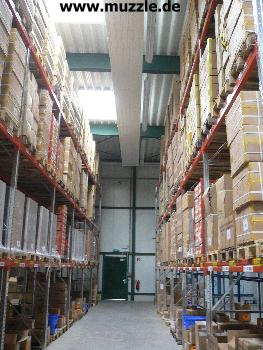 Verpackungseinheiten werden vor dem Verladen gewogen und können dann über das erfasste Gewicht auf dem Transport bis hin zum Warenempfänger bei Bedarf kontrolliert werden. Herr Beisheim betonte, dass es seit Einführung dieser Kontrollmechanismen nicht mehr zu nennenswerten Reklamationen wegen Warenverlusten gekommen ist. Station 13: Munitionslager Das UMAREX-Munitionslager ist ein modernes Hochregallager neuen Datums. Hier lagern vor allem explosive Waren bis hin zur Pyromunition. Diesen kritischen Eigenschaften der Güter trug man mittels der besonderen Bauweise des Lagers Rechnung. Das Gebäude würde im Falle eines Feuers und damit verbundener Explosion die Druckwelle weitestgehend nach oben ableiten und die horizontale Ausbreitung so minimal wie möglich halten. Sozusagen ein Dach als Sollbruchstelle.
