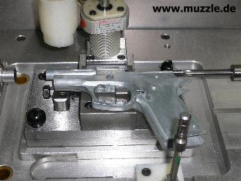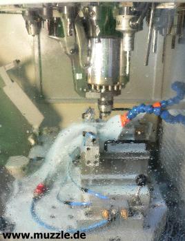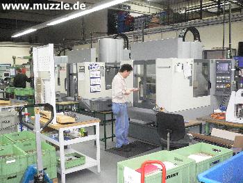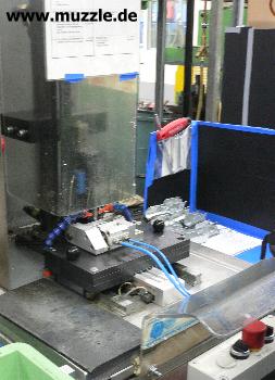 Die Teile, hier im Bild (s.o.) Pistolenschlitten, werden von verfahrenstechnisch spezialisierten und zertifizierten Fachfirmen aus der Region um das Arnsberger UMAREX-Werk angeliefert. Das Entgraten der Zinkspritzgussteile geschieht auf Sichtprüfung und wird in sorgfältiger Handarbeit durchgeführt. Grate lassen sich bei diesem recht aufwändigen Herstellverfahren, bei dem eine verflüssigte Zinklegierung unter starkem Druck und hohen Temperaturen in mehrteilige Formen gespritzt oder gegossen wird, nicht gänzlich vermeiden. Um so wichtiger ist diese Nachbearbeitung, bei der auch eventuelle Ausschussware aussortiert wird. Würden Grate, unsaubere Kanten oder Narben etc. an den Werkstücken zurückbleiben, wäre dies kein guter Grundstein für ein hochwertiges Oberflächenfinish, gemäß den Qualitätsstandards des Sportwaffenherstellers. Station 2: High-Tech Bohr- und Fräsmaschinen