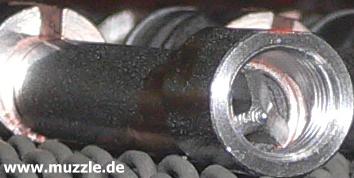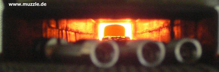 Bereits zu diesem Zeitpunkt des Rundganges wurde klar, dass sich die Fertigungsprozesse einerseits aus hochtechnisierten Schritten, vielfach aber auch aus spezialisierter Handarbeit zusammensetzen. Maschinen vermögen also manuelle Arbeitsvorgänge nicht gänzlich zu ersetzen. Rechts oben im Bild eine Maschine, die den Schlittenausschnitt für das horizontal verschiebbare Kimmenbauteil auf genaues Maß bringt. Immer wieder wird von einem Mitarbeiter mittels Passstück geprüft, ob die Maßhaltigkeit noch gegeben ist. Ist die Toleranzgrenze überschritten, muss das Schneidwerkzeug ausgetauscht werden. Station 4: Lötofen / Laufsperren in Schreckschusswaffen Bekanntermaßen ist UMAREX einer der großen Hersteller von Signalwaffen. Knallwaffen sind ähnlich aufwändig abzustimmen wie scharfe Waffen. Deren Verdämmung muß sehr genau auf verschiedene Funktionen der Waffe angepasst werden. Erschwernisse bei der Fertigung bringen nicht zuletzt auch die deutsche Gesetzgebung, verbunden mit den strengen Vorschriften der „Physikalisch Technischen Bundesanstalt“ (PTB) mit sich.