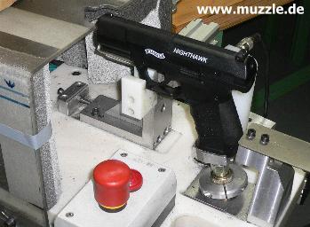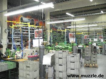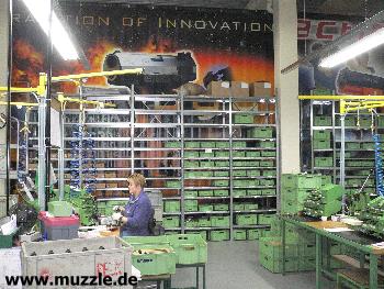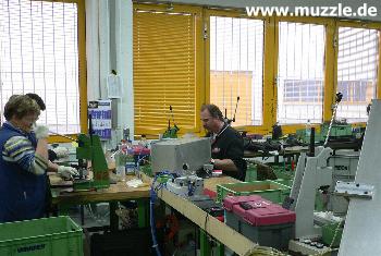 In diesem Teil der Werkhalle werden die CO2-Waffen montiert, und nach der Fertigstellung an stationären Schießkästen sogleich einem Schusstest unterzogen (Bild unten rechts). An den Arbeitsplätzen sind Schilder angebracht, die sofort erkennbar machen, welches Waffenmodell gerade montiert wird. Hier die CPS-Modell- variante „Night Hawk“