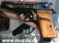 Wie es nun mal so ist, jeder schöne Tag geht einmal zu Ende, und so hieß es dann für mich, den Heimweg anzutreten. Natürlich mit dem Vorsatz bewaffnet, meine Erlebnisse in einem kleinen Bericht zusammenzufassen und zu publizieren. Der liegt nun vor, und ich hoffe, ich kann damit dem geneigten Leser hier einige interessante und lesenswerte Eindrücke vermitteln. Bilder unten: links, “Walther Lever-Action”- Gewehre / rechts, “Walther PPK”-Signalwaffe mit aufwändiger Gravur und edlen Holzgriffschalen.