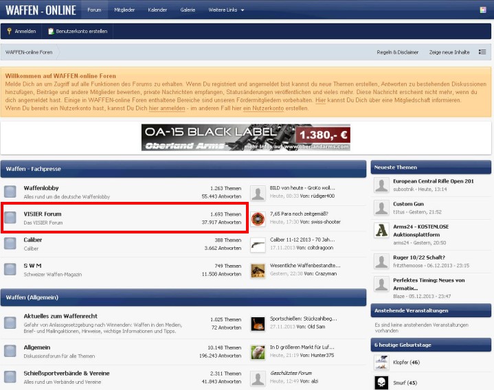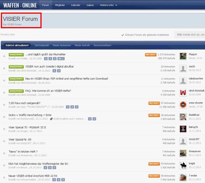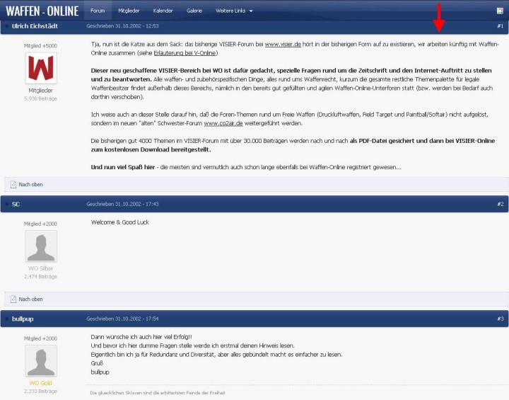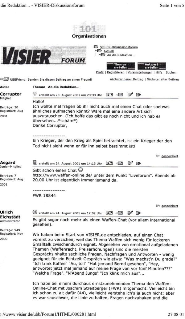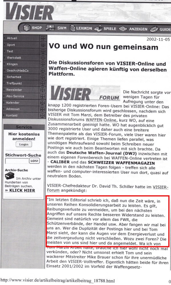 Das eigenständige VISIER-Diskussionsforum, lang ist’ s her... Rückblende und Nachbetrachtung: Von Dezember 2000 bis November 2002 betrieb die Redaktion der Waffenzeitschrift VISIER ein eigenständiges Waffen-Diskussionsforum im Internet (Screencopy unten). Dann wurde der Betrieb recht abrupt eingestellt. VISIER gab sein eigenständiges Profil auf und kroch als eines von etlichen Subforen bei “waffen-online” (WO) unter. Dortiger Inhaber und Admin war damals Tom Marzi. Begründet wurde dieser Schritt offiziell als eine notwendige und überfällige Konsolidierungsmaßnahme. Angeblich sollte es darum gehen, die Kräfte zu bündeln, um effektiveren, fokussierteren Widerstand gegen die Angriffe der Verbotstreiber der Anti-Waffenkräfte auf die Rechte der legalen Waffenbesitzer in Deutschland und Europa organisieren zu können.