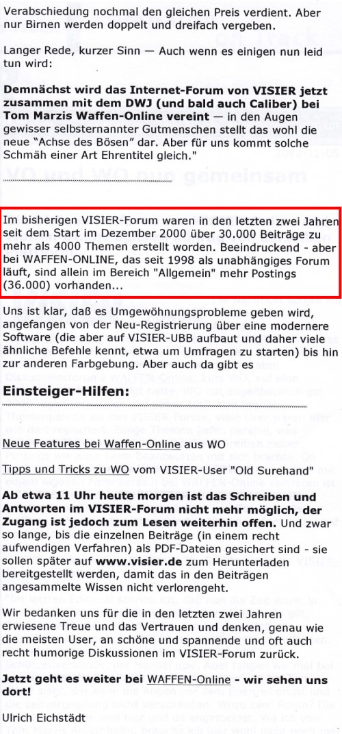 Man darf wohl getrost davon ausgehen, dass es aber sicher auch darum ging, die Betriebskosten (Server/ Traffic/Administration, etc.) der eigenen Online-Plattform einzusparen. Dafür war man bereit, das gut besuchte VISIER-Forum mit seiner lebendigen, eigenständigen Community zu opfern und in der Beliebigkeit des uniformen WO-Forums versinken zu lassen. So stellte Dr. Schiller, damals VISIER-Chefredakteur, in der u. g. Meldung die rhetorische Frage in den Raum: “Wozu zwei Foren?” - Also wozu die Duplizität der Postings hüben und drüben. Schließlich sind die meisten ja eh in beiden Foren angemeldet... Für mich blanker Unsinn, denn gerade die Vielfalt an verschiedenen Angeboten macht den Reiz aus, belebt die Szenerie und stellt u. U. einen Gegenpol zum Mainstream dar. Vor allem konnte sich so jeder die Heimat suchen, die ihm genehm war. Viele waren mit dem schon damals überwiegend als unfreundlich und überheblich empfundenen Umgangston bei “WO” nie warm geworden. Und so bedauerten die meisten Stammuser des VISIER-Boards den Umzug ins WO-Subforum in erheblichem Maße. Das war definitv ein herber Imageverlust von VISIER und damit m. E. eine krasse Fehlentscheidung, da man das Heft des Handelns ohne Not, aber wohl aus pekuniären Erwägungen, in fremde und damit auch unkontrollierbare Hände gab.
