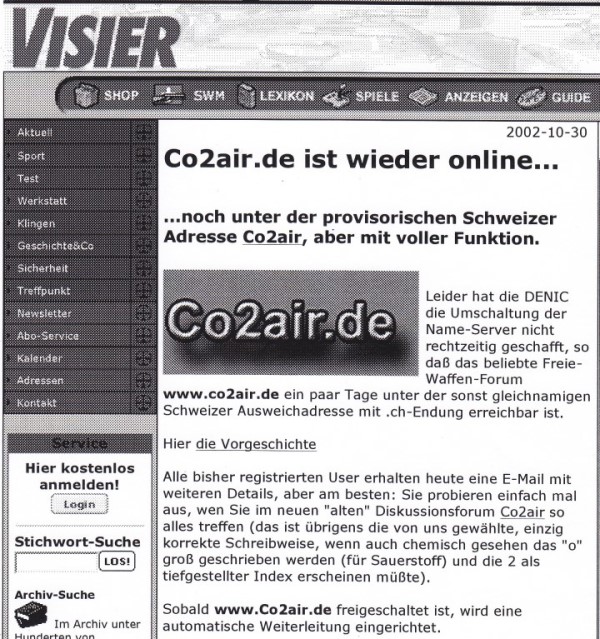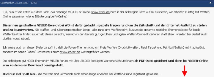 Merkwürdige, nicht nachvollziehbare Inkonsequenz bei der Entscheidung durch die VISIER-Führung! Rufen wir uns an dieser Stelle noch einmal die Worte des damaligen VISIER-Chef-Redakteurs in Erinnerung: “Wozu zwei Foren?” Ja eben! Wenn die vorgegebene Zielrichtung angeblich die Bündelung der Kräfte war, warum erwarb VISIER die Eigentumsrechte am rein auf freie Waffen spezialisierten “co2air.de” und führte dieses Forum unter eigener Regie bis heute weiter? Das macht vordergründig doch überhaupt keinen Sinn, denn bei “WO” gab und gibt es auch ein Unterforum für alle Themen rund um freie Waffen. Am 5.11.2002 schickt VISIER sein damals bestehendes Diskussionsform quasi in die Bedeutungslosigkeit und kündigt fast zeitgleich (30.10.2002) die baldige Reaktivierung des gerade von einem privaten Betreiber übernommenen “co2air”-Boards an. Tja, klingt komisch, ist aber so! Einheitliches, nachvollziehbares Vorgehen und “klare Kante” sehen anders aus! Es ist wohl ganz einfach so, dass sich dieser “Service von VISIER”, sprich die Trägerschaft des “co2air”-Forums, kommerziell ganz prima ausschlachten lässt und für VISIER ein Standbein darstellt, welches diesem Special-Interest-Magazin doch noch so etwas wie ein eigenständiges Profil verleiht. Wenn auch “nur” auf dem Sektor “Freie Waffen”.