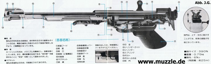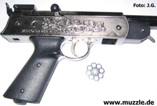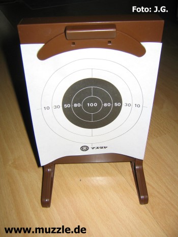Zubehör: Kugelfang, Zielscheiben, Munition in Kunststoffdose im Patronendesign, Pipette für Öl, Bedienungsan-
