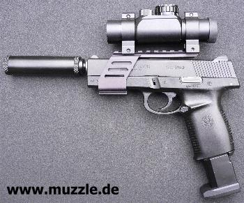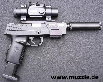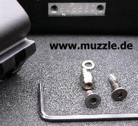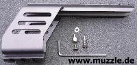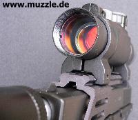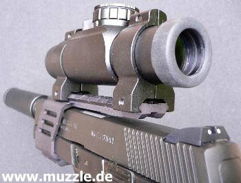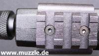 aus Leichtmetall hergestellte Weaverschienenmontage an die Waffe bauen, die die Voraussetzung für die Installation eines Leuchtpunktvisieres schafft. Da der aufgeschraubte Schalldämpfer in die Visierlinie der