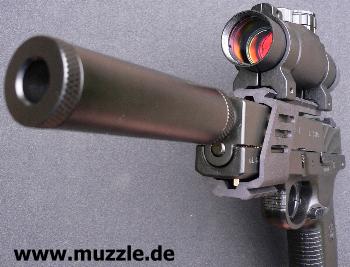 offenen Visierung hineinragt, und damit das Zielen erschwert, sollte man im Verbund mit der Laufverlängerung eben auch eine Zielhilfe montieren. Es sei denn, man verzichtet auf die Verkleidung des weit über die Mündung