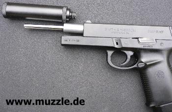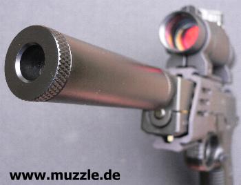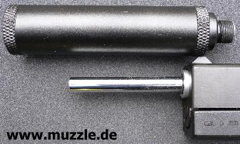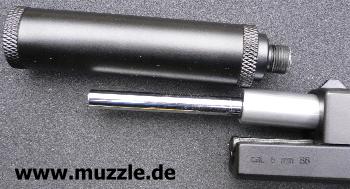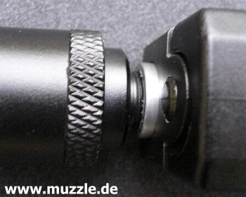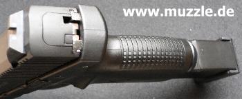 Schalldämpfer-Attrappe ausgerüstet wird? „Versuch macht kluch“... also mit ein paar Handgriffen schnell umgerüstet und schon folgen die Tests mit der 6-zölligen Version: Das Schussgeräusch vermindert sich