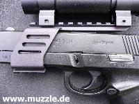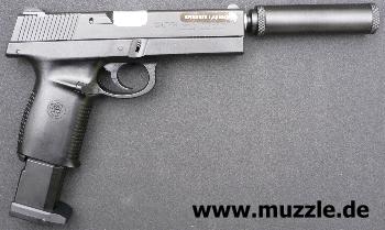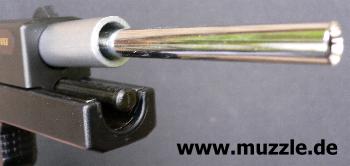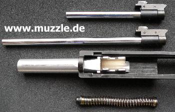 Fachhandel einige Aufrüstteile an, welche die Pistole optimieren sollen. Neben einer Laufverlängerung von 4“ auf 6“, die von einem als Schalldämpferattrappe „getarnten“ Laufmantel garniert wird, kann man auch eine