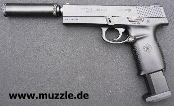im hinteren Bereich abgesenkt. Der Lauf selber hingegen bleibt waagerecht. Diese Verwinkelung wird bei montiertem 6”-Lauf deutlich. Aus diesem Grunde muss im Innern des “Schalldämpders” genug Freiraum
