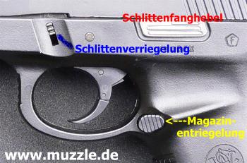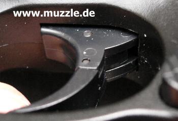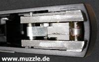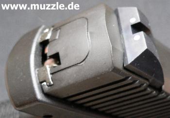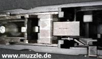 links) , weil man ansonsten den Schlitten nach dessen Entriegelung nicht nach vorne abziehen kann, wie es in der Bedienungsanleitung beschrieben steht. Also nach dem Entnehmen des Magazinbauteils und dem