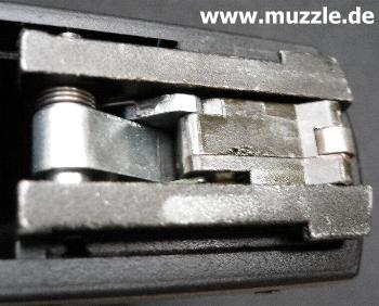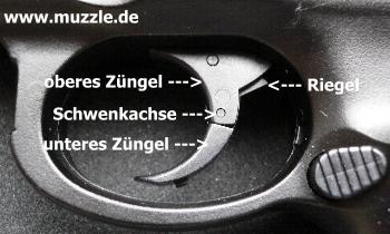 des Züngels und macht nun erst das Auslösen der Mechanik möglich. Zieht man das Züngel also nicht sauber durch, bleibt der Riegel am Waffengehäuse hängen und macht ein Durchziehen des Abzuges und damit die