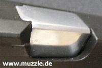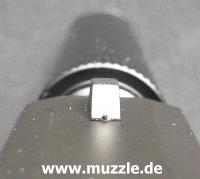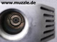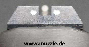 „Schalldämpfer“ ragt in die Visierlinie hinein (Bild unten rechts), was die Tauglichkeit der offenen Visierung beschneidet und die Verwendung eines „Reddot“ empfehlenswert macht.