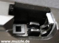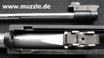Bilder unten: Geschlossenes “Auswurffenster” am Schlitten (links) - Geöffnetes “Auswurffenster” bei zurück-