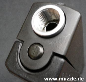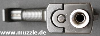 lässt sich der Schlitten im Handumdrehen vom Griffstück lösen. Allerdings muss man dabei auf einen wichtigen Punkt achten: Der Innenliegende Hahn darf auf keinen Fall aus dem Griffstück herausragen (siehe Bild oben