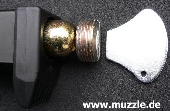 der innenliegende Hahn für die Ventilöffnung und damit Schussauslösung auftrifft (rechts)