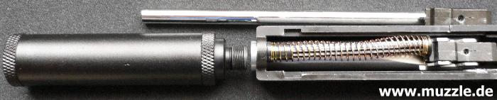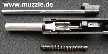 Bilder unten: Um den Lauf zu tauschen, zunächst die Schlittenfeder entnehmen, dann die Laufhülse nach vorne