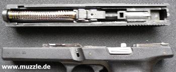 Schlittenverriegelung (über dem Abzugsbügel) nach unten schieben und den Schlitten nach vorne vom Griffstück abziehen. - Beim Zusammenbau darauf achten, das der innenliegende Hahn nicht hochsteht. Diesen