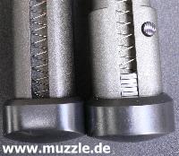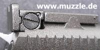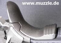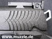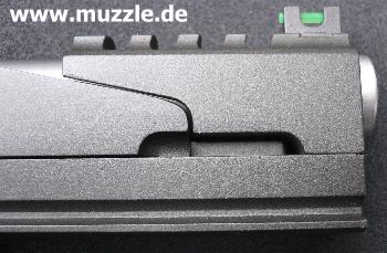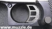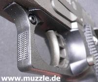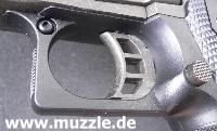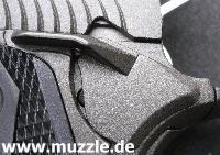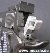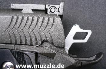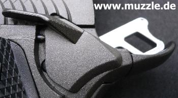 zeugt ebenso von diesen Bestrebungen, wie das durchbrochene Abzugszüngel, der Beavertail)* und die großen Sicherungsflügel. (Bilder unten)