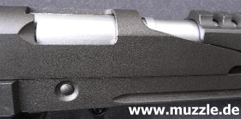 Bild unten links: Blick in das offene Patronenauswurffenster auf den Laufansatz. Bild unten rechts: Groß-